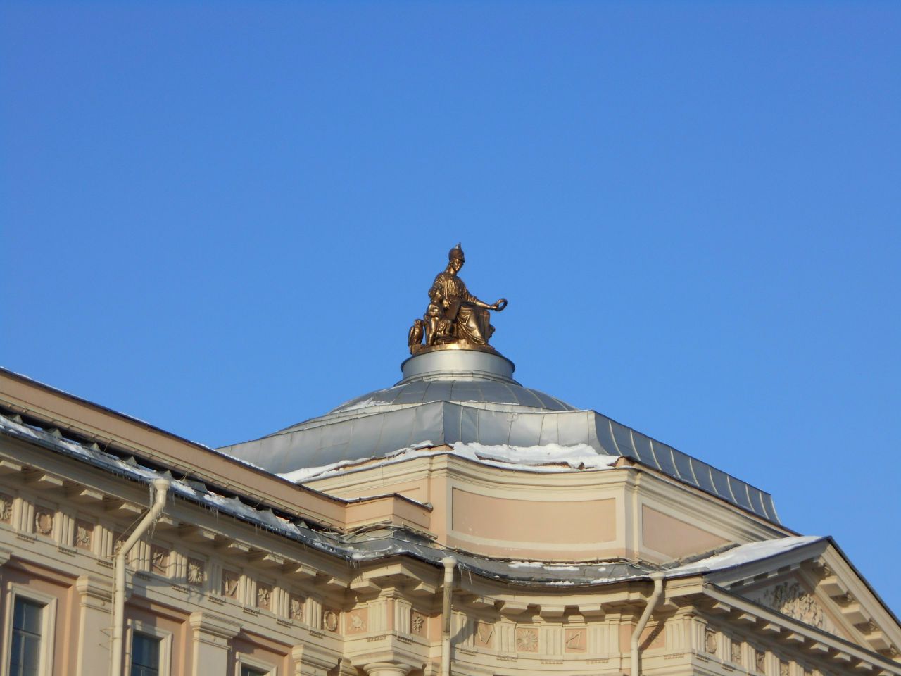 С самого начала купол в центре фасада украшала деревянная скульптура. В 1840-х гг. она погибла от удара молнии. В 1885 г. была установлена новая скульптура Минервы (ск. А. фон Бок), которая погибла при пожаре в 1900 г. Нынешняя скульптура, установленная в 2003 г. - уже третья по счету.